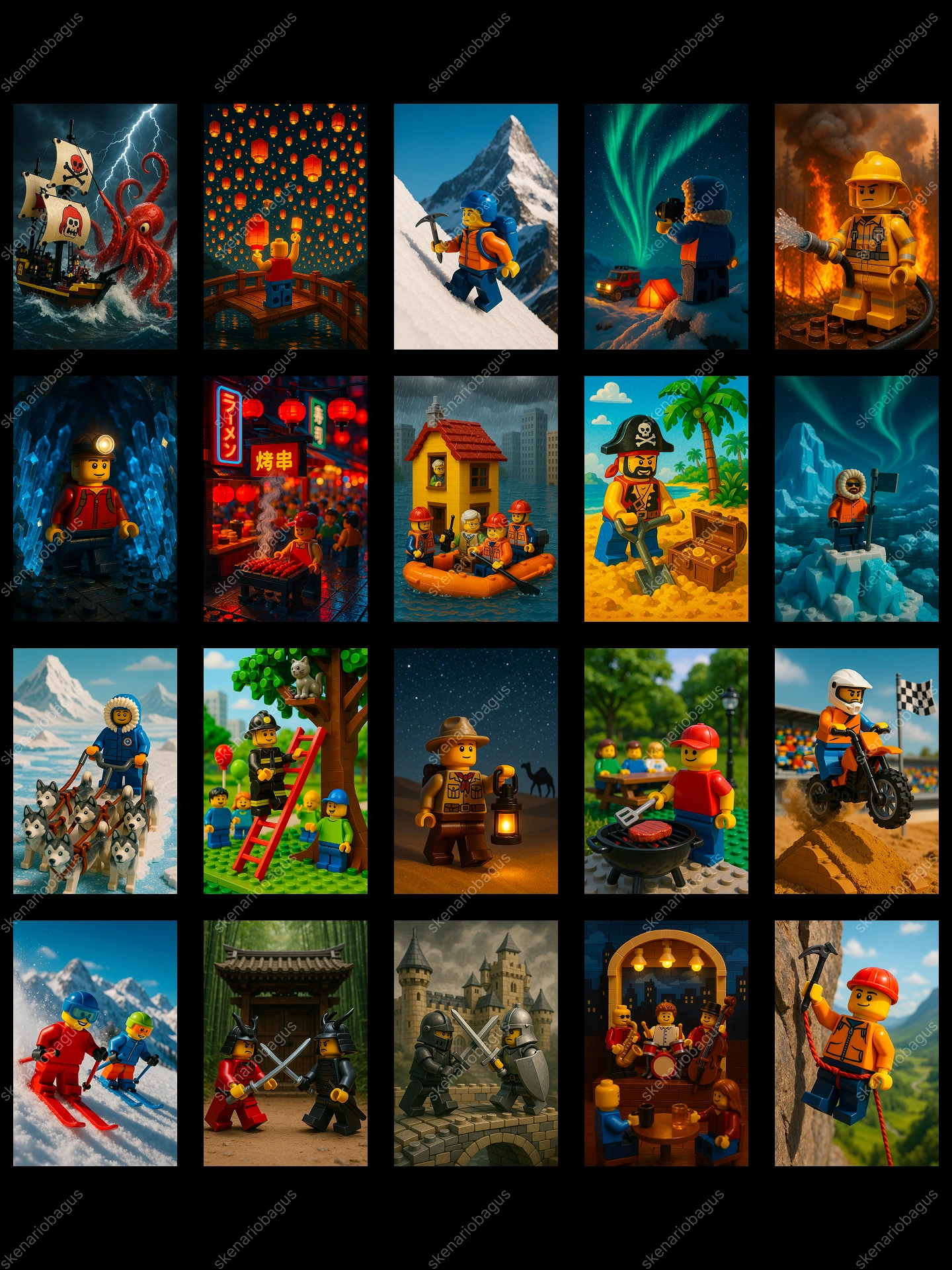 Koleksi eksklusif berisi 50 prompt premium yang dirancang khusus untuk menghasilkan ilustrasi LEGO ultra-realistik bergaya sinematik. Setiap prompt disusun dengan detail profesional, menghadirkan berbagai adegan penuh cerita