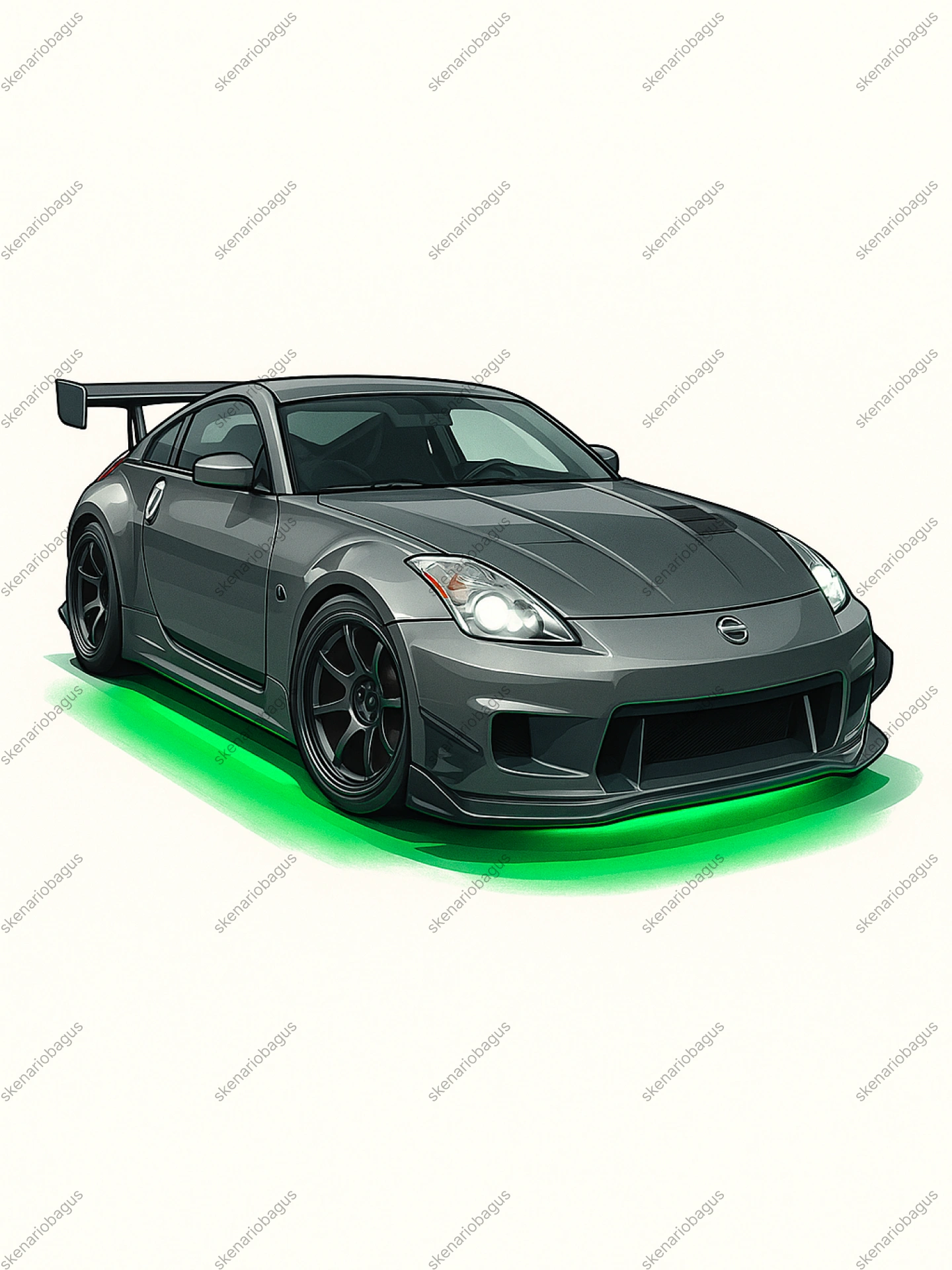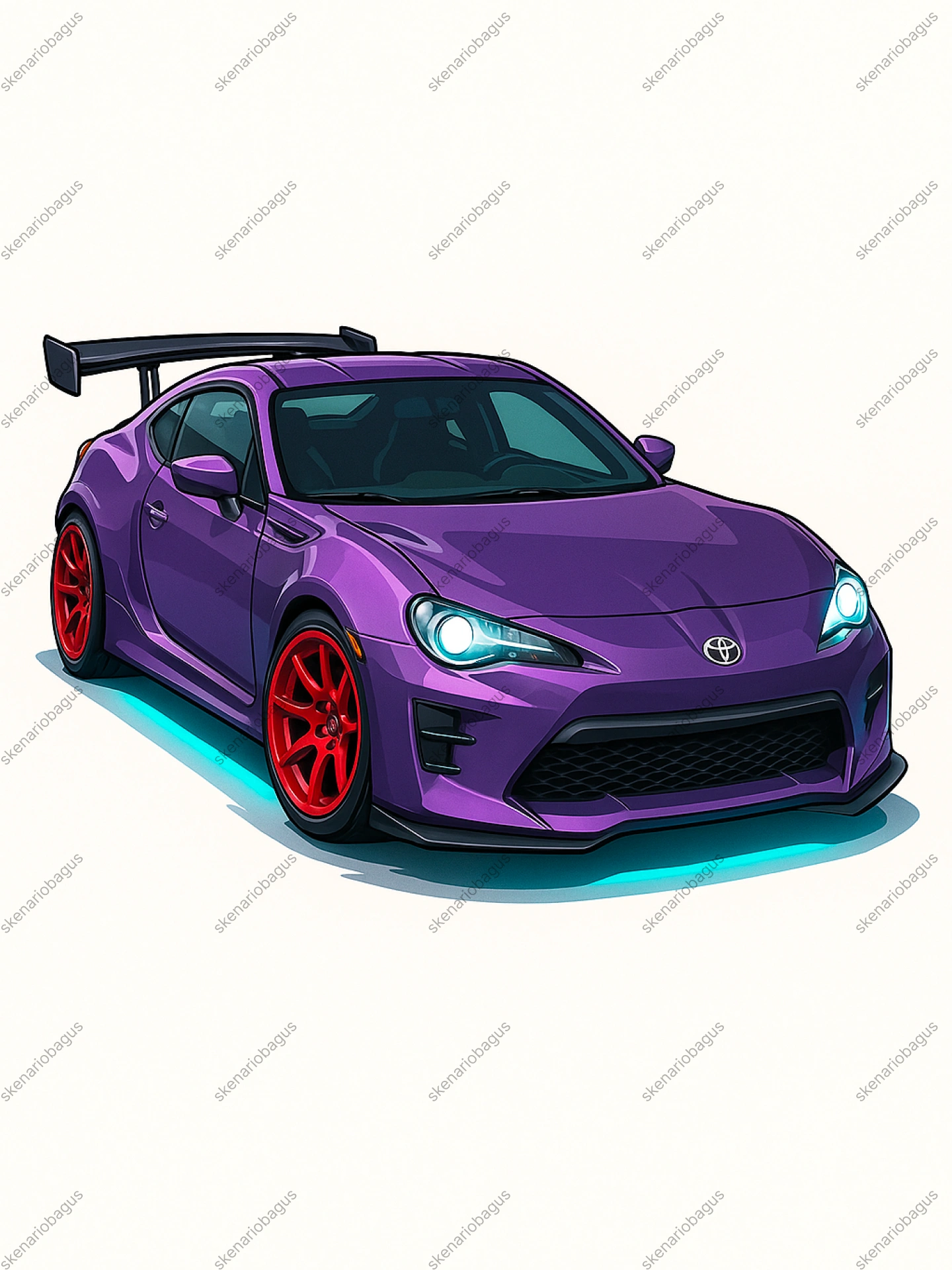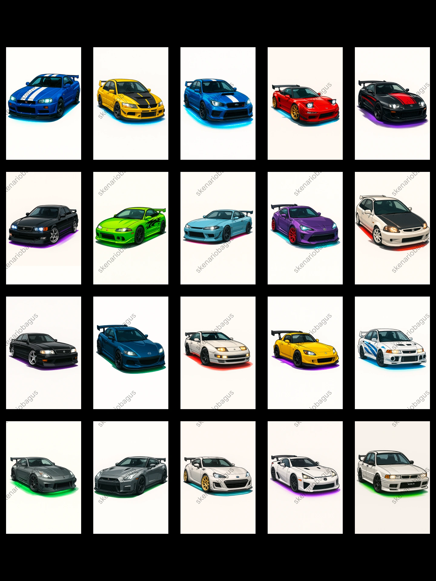 25 prompt eksklusif untuk menghasilkan ilustrasi mobil sport JDM ikonik bergaya kartun vektor semi-realistic dengan detail balap yang menawan dan efek neon underglow memukau. Proporsi realistis dengan sentuhan stylized, garis tegas, dan cell shading rapi, dipadukan dengan latar belakang putih polos yang membuat mobil semakin menonjol.